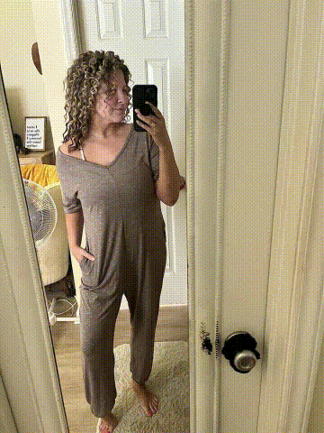 "The jumpsuits loose without being too baggy. I love that I can pull the legs up or down, just like joggers, and it looks good off the shoulder or on!"