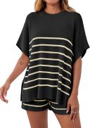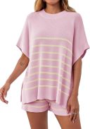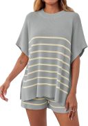 Elevate your loungewear collection with our Women's Striped Batwing Short Sleeve Tops High Waisted Shorts Knit Lounge Sets. Crafted with comfort and style in mind, these sets are perfect for relaxing at home or running errands in chic fashion.