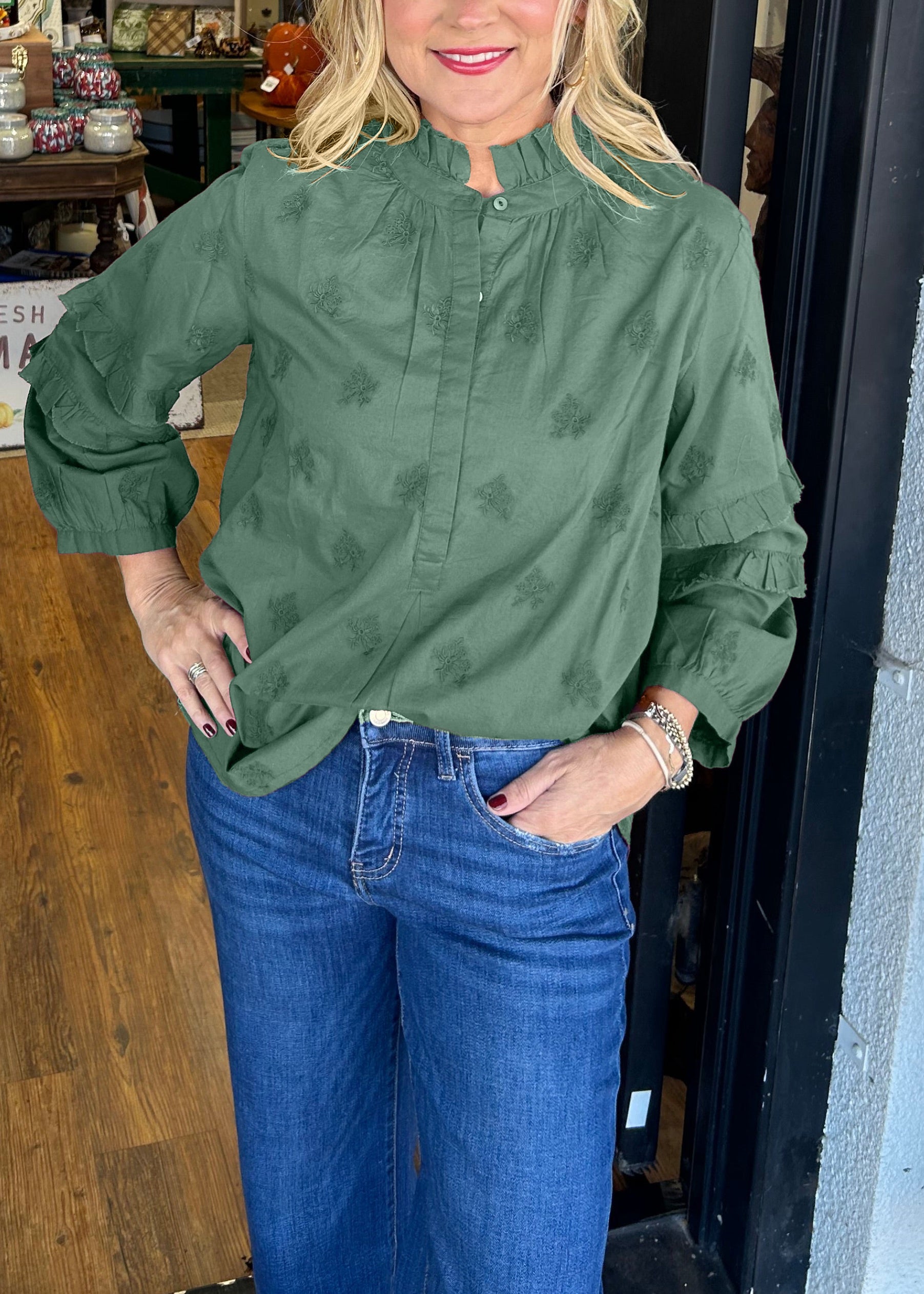 - Ruffled tiered sleeves